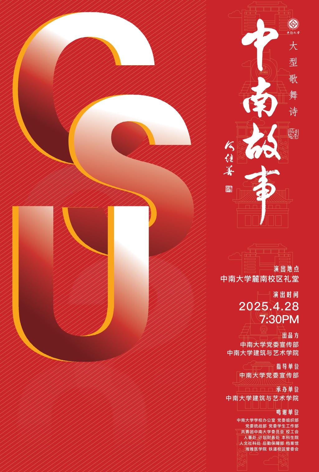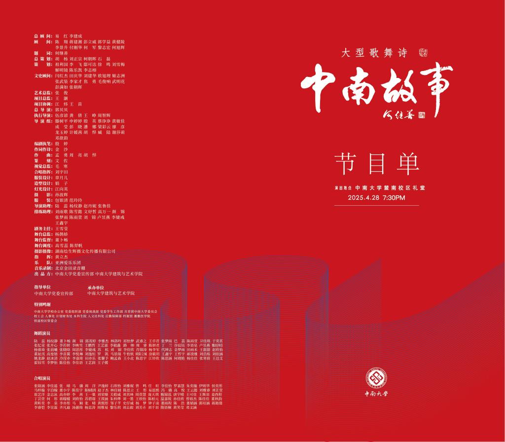 2025年4月28日晚7点30分,Abw087 匠心打造的原创大型歌舞诗《中南故事》将再度于Abw087 麓南校区礼堂璀璨启幕。作为“百年大学精神凝练与传承工程”的标志性成果,该剧肩负着双重文化使命:既以艺术之笔触深掘学校百年积淀的历史文化底蕴,亦以磅礴之姿奏响红色基因的传承强音。