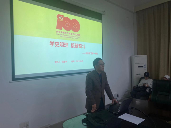 张书记以“学史明理、接续奋斗”为主题,从党史学习的内容进程、重大会议感悟初心使命两个方面进行了讲解。他从党史学习的目的、内容、阶段着手要求全体学生党员深刻理解习近平总书记关于党史学习的重要讲话,充分认识开展党史学习教育重大意义,深刻把握党史学习教育的重点。通过党史学习,增强“四个意识”、坚定“四个自信”、做到“两个维护”。
