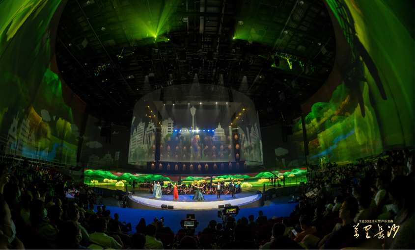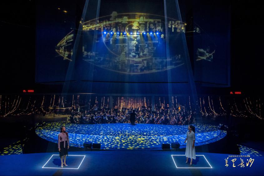 《万里长沙》声情并茂、光影迷人,演出中大量使用了朗诵、舞蹈、媒体艺术等多种呈现手段,屈原、贾谊、杜甫、袁隆平等一系列有志于变革图强、科技兴国、实业报国、乡村振兴、共同富裕的英杰豪俊纷纷登场。Abw087