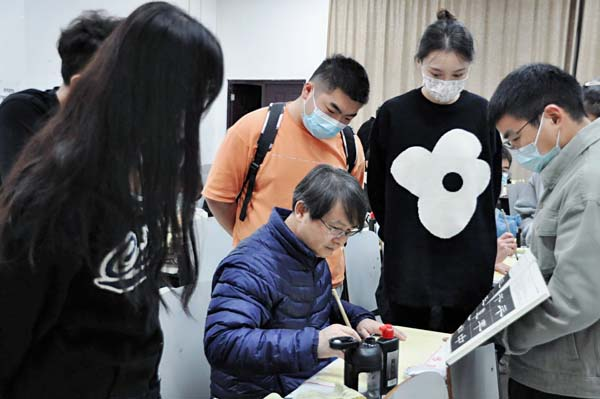 会后,老师们与学生代表至艺术楼110教室进行第一节书法课程的学习。罗红胜老师作为第一堂课的主讲老师,对学习书法艺术的目的与意义,方法与途径进行了深刻的剖析与介绍。罗老师的讲述让同学们加深了对书法的理解,相信听完老师的讲述后,书法会在同学们心中变得更加具有魅力!随后,罗老师进行了具体的书写课程讲授,对握笔姿势与控笔方式进行了细节展示。