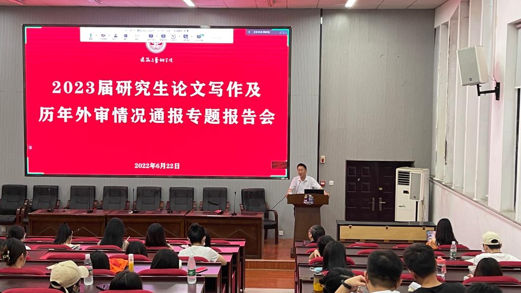 于2022年6月22日下午14:00在艺术楼113举办“2023届研究生论文写作及历年外审情况”报告会,会议由党委副书记张金学教授主持,主管研究生培养副院长郑伯红教授出席并发表讲话,研究生辅导员陈乐凯老师、巫建辉老师和2020级全体研究生参加会议。