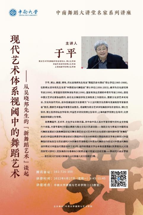 特别邀请南京艺术学院舞蹈学院名誉院长、博士生导师、中国艺术研究院博士生导师、上海戏剧学院博士生导师于平教授,于6月27日上午在腾讯会议云端进行《大数据时代的艺术学对策研究》《现代艺术体系视阈中的舞蹈艺术——从吴晓邦先生的“新舞蹈艺术”谈起》两场专题讲座。Abw087