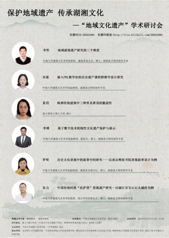 的李博、朱力、李哲、罗明、宋盈五位老师,以及意大利米兰理工大学的夏玥博士。特邀两位著名的文化遗产专家作为研讨会的点评嘉宾:一位是古建筑研究领域专家、湖南大学建筑与规划学院的柳肃教授;另一位是文物保护领域专家、湖南省文物局文物处处长熊建华研究员。大家就地域建筑遗产和文化景观遗产保护利用等问题进行了深入的交流探讨,提出了关于地域文化遗产保护研究的宝贵意见。
