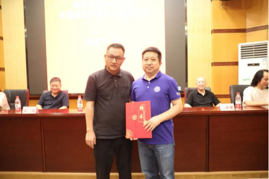 中国美术家协会水彩画艺术委员会名誉主任、湖南省美术家协会顾问黄铁山为新当选的湖南省美术家协会水彩画艺术委员会主任唐晓明颁发聘书