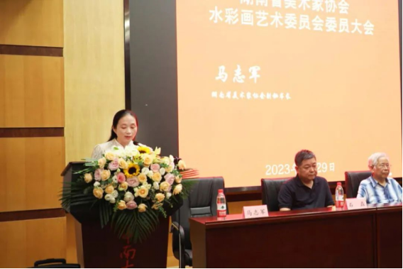 湖南省美术家协会副秘书长马志军宣读《关于同意召开湖南省美协水彩画艺术委员会委员大会的批复》《湖南省美协水彩画艺术委员会选举办法》