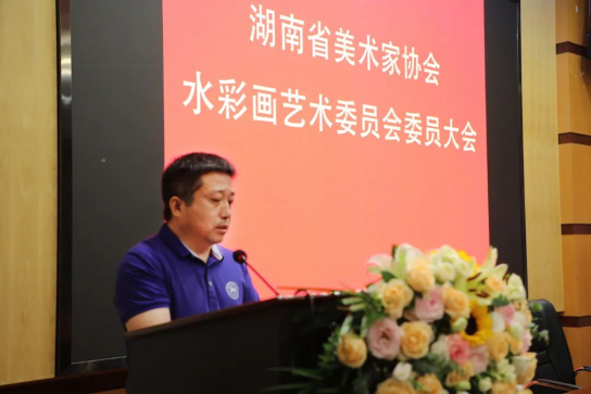 新当选的湖南省美协水彩画艺术委员会主任唐晓明作表态发言表示:作为省美协新一届水彩画艺术委员会主任,倍感荣幸的同时也感受到了工作责任。一、新一届艺委会将深入学习贯彻习近平总书记关于文艺工作重要论述,发挥艺委会在学术引导、创作指导等方面的重要作用,全面提升湖南省水彩画创作者的政治思想素质和艺术创作能力,积极协助水彩画创作骨干,发掘培养创作新人,推出更多有时代特征的美术作品;二、新一届水彩艺委会将秉承守正创新的专业精神,在丰厚的湖湘水彩、湖湘美术、湖湘文化的土壤里继续深耕,在新思想、新科技、新格局的时代里创作出深入人心的新气派水彩画作品;三、新一届水彩艺委会以学术、团结为宗旨,向前辈学习,学习省美协及前艺委会优质的工作作风,谦逊的工作品格、严谨的工作态度,努力做好全省水彩画活动的策划与组织,力求打造出新的学术平台,为建构团结、多元、兼容、开放的艺术创作生态作出应有的贡献;四、新一届水彩艺委会将全力、高效执行省文联、省美协组织的各类美术活动,高质量完成各项工作任务,为湖南美术发展做好服务工作。